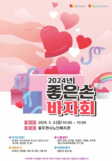 특히‘2024년 좋은손 바자회’는 지역주민들을 비롯한 후원업체 등의 참여로 진행되는데, 기증받은 물품을 중심으로 각종 장터를 운영, 저렴한 가격으로 지역주민에게 판매할 예정이며, 수익금은 동두천 저소득 취약계층 어르신들을 위해 전액 사용된다.