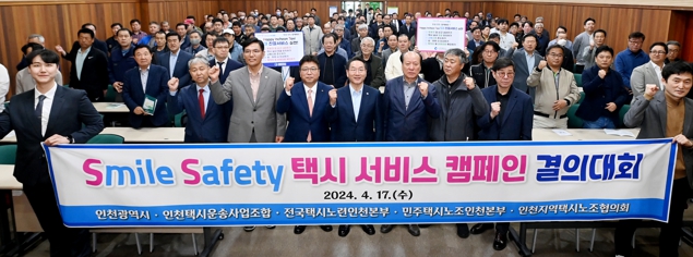 인천광역시는 17일 인천교통연수원에서 지역 법인택시업계 노‧사 대표와 운수종사자 등 160여 명이 참여한 가운데, 친절하고 안전한 택시서비스 제공을 약속하는 ‘에스에스(SS, Smile‧Safety) 택시 서비스 캠페인 결의대회’를 공동 개최했다고 밝혔다.