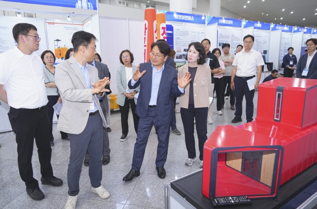 ▲ 강기정 광주광역시장이 18일 오전 시청 시민홀에서 열린 '기술혁신인증제품 실증지원 사업 매칭데이'에 참석해 부스를 둘러보고 있다./광주광역시 제공 |