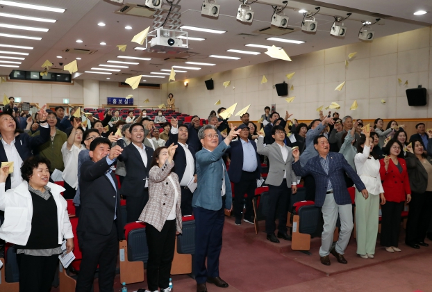 ▲ 30일 구청 대강당에서 주민자치회 위원 160명을 대상으로 역량강화 교육을 실시한 가운데, 정용래 유성구청장(왼쪽에서 네 번째)과 참석자들이 퍼포먼스를 하고 있다.