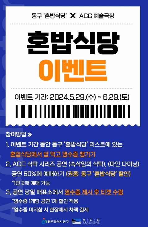 참여 방법은 동구 혼밥식당을 이용한 후 국립아시아문화전당 누리집에서 ACC 식탁 시리즈 공연을 50% 할인된 가격에 예매하면 된다.