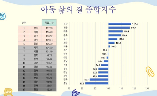 국제아동권리 비정부기구(NGO) 세이브더칠드런과 서울대학교 사회복지연구소가 지난 2일 발표한 ‘2024 한국 아동의 삶의 질’ 연구 결과, 부산은 아동 삶의 질 종합순위에서 가장 높은 점수를 획득했다.
