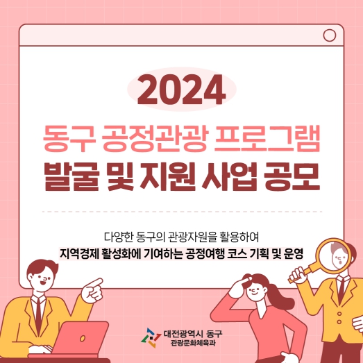 박희조 동구청장은 “이번 공모사업을 통해 동구의 관광자원을 활용한 프로그램을 발굴하고 지역에 활력을 불어넣고자 한다.”며, “공정관광에 관심있는 단체의 많은 신청을 바란다.”고 밝혔다.