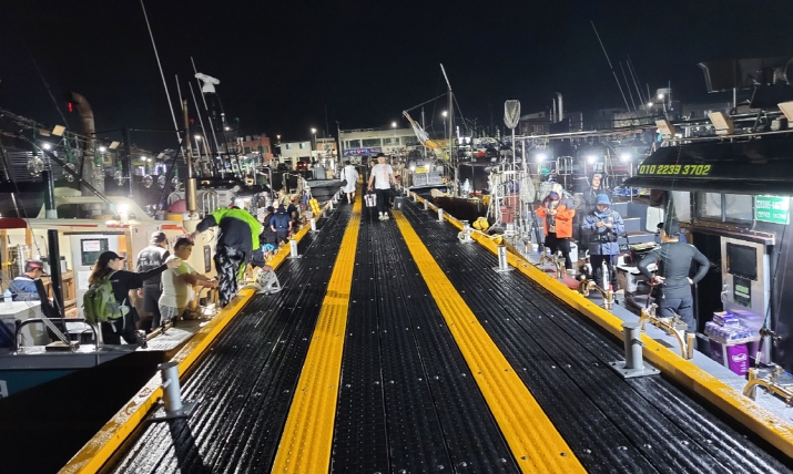 ▲ 대규모 낚시객들이 바다낚시 어선에 승선하고 있다. |