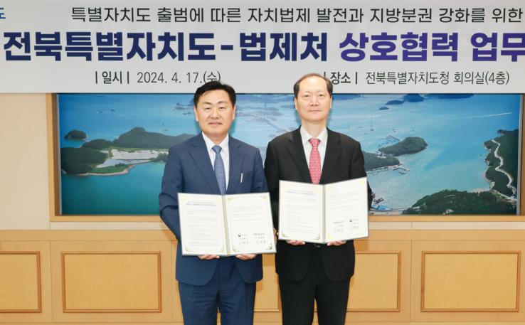 김관영 전북특별자치도지사는 “오늘 협약을 계기로 전북특별자치도의 법제 기반을 든든히 구축할 큰 힘을 얻게 되었다”며, “자치법규 입법 지원 등 폭 넓은 협업이 이루어지길 기대한다”고 말했다.