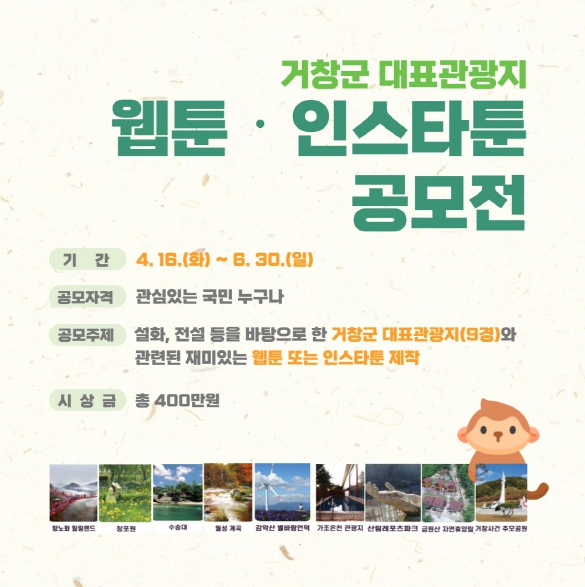 [뉴스서울] 거창군은 대표관광지 선정 후속사업으로 대표관광지와 관련된 다양한 스토리를 만화로 표현하는 웹툰‧인스타툰 공모전을 오는 6월 30일까지 개최한다.