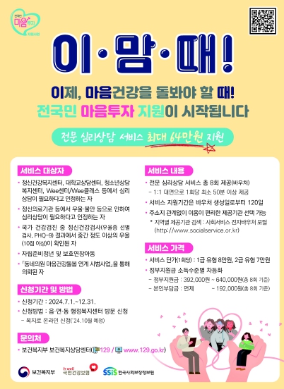 심리상담 서비스 바우처는 120일간 총 8회, 회당 최소 50분 이상이 제공된다. 올해 지원 대상은 540명 정도이고 정신건강복지센터 등에서 심리상담이 필요하다고 인정받은 자, 정신의료기관에서 심리상담 필요 소견 또는 진단을 받은 자, 국가 정신건강검진 결과(PHQ-9)에서 10점 이상이 확인된 경우, 자립준비청년 및 보호연장아동 등이 그 대상이다.