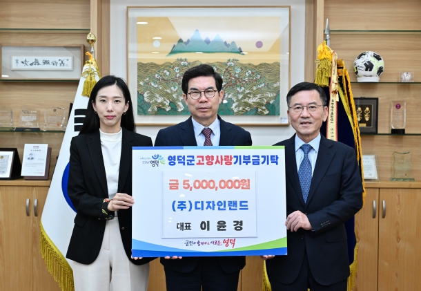 ▲ ㈜디자인랜드 이윤경(왼쪽) 대표와 이동헌 회장(오른쪽)이 김광열 영덕군수(가운데)에게 고향사랑기부금 500만 원을 전달하고 있다. |