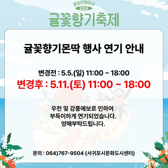 [뉴스서울] 서귀포시 문화도시센터는 2024 봄꽃하영이서 귤꽃향기축제 `귤꽃향기몬딱' 행사를 5월 5일 상효2동 마을회관 일원에서 개최할 예정이었으나 이날 매우 강한 바람과 많은 비가 예보됨에 따라 5월 11일로 일정을 변경해 개최한다.