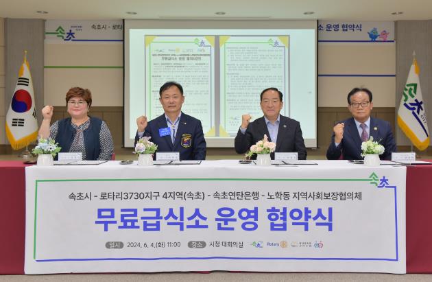 [뉴스서울] 속초시는 로타리3730지구 4지역(속초)-속초연탄은행-노학동지역사회보장협의체와 4일 취약계층 어르신 대상 무료급식소 운영을 위한 협약식을 개최했다.
