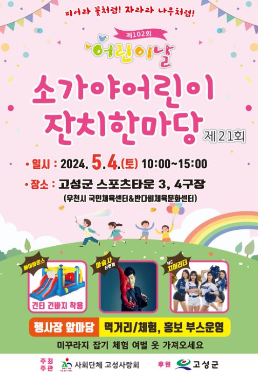 [뉴스서울] 고성군은 제102회 어린이날을 맞아 ‘피어라 꽃처럼! 자라라 나무처럼’이라는 슬로건 아래 오는 5월 4일 오전 10시부터 스포츠타운 3·4구장에서 1,000여 명이 참석하는 ‘제102회 어린이날 행사 및 제21회 소가야어린이 잔치 한마당’을 개최한다고 밝혔다.