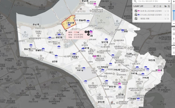 [뉴스서울] 송파구(구청장 서강석)가 관내 공공시설 현황과 기부채납 발생 예정지 등을 한눈에 지도로 파악할 수 있는 통합 DB를 구축하고, 오는 7월 말부터 용도 검토 등 행정실무에 활용한다고 알렸다.