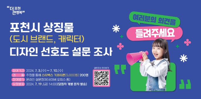 설문조사는 포천시청 누리집과 사회관계망서비스(SNS)에 게시된 주소를 통해 참여할 수 있다. 추첨을 통해 참여자 중 200명을 선정해 5천 원 상당 스타벅스 기프티콘을 증정할 계획이다.