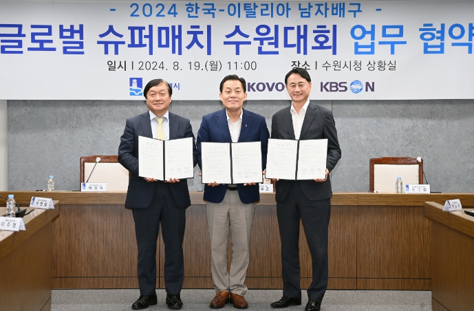 수원시와 한국배구연맹, KBSN은 19일 수원시청 상황실에서 업무협약을 체결하고, ‘2024 한국·이탈리아 남자배구 글로벌 슈퍼매치 수원대회’의 성공적인 개최를 위해 협력하기로 했다.