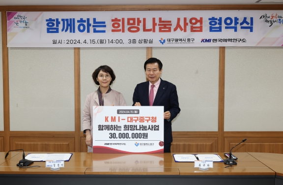 [뉴스서울] 대구 중구는 15일 구청 상황실에서 KMI 한국의학연구소와 지역 내 의료취약계층 지원과 유기적인 상호협력체계 구축을 위한 ‘함께하는 희망나눔 협약’을 체결했다.