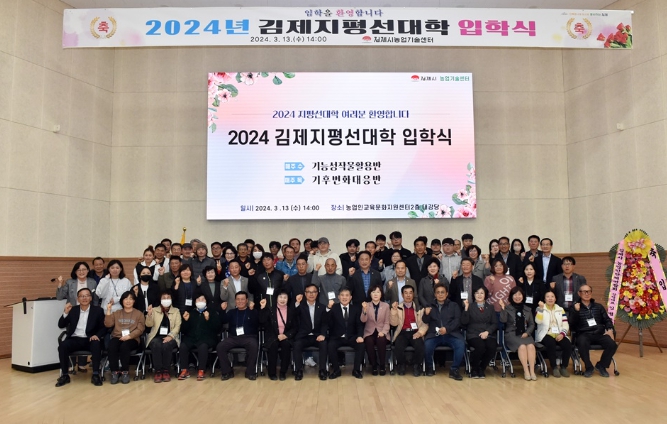 [뉴스서울] 김제시는 13일 농업인교육문화지원센터에서 지평선대학 입학생과 시장, 시의회 의장 등 100여명이 참석한 가운데 제20기 김제지평선대학 입학식을 개최했다고 밝혔다.