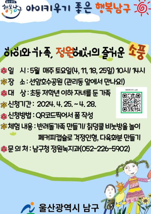 [뉴스서울] 울산 남구는 5월 가정의 달을 맞아 선암호수공원 일원에서 ‘아이와 가족, 정원에서의 즐거운 소풍’프로그램을 운영한다고 26일 밝혔다.