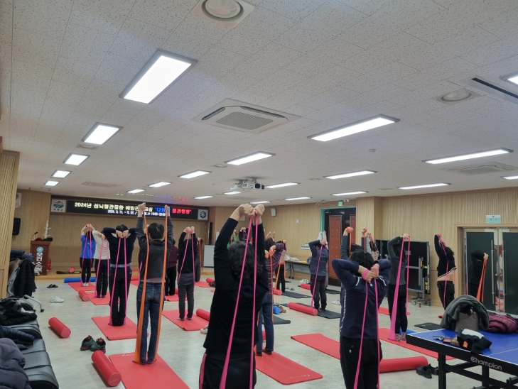 '다함께 혈관짱짱'은 2024년 심뇌혈관질환 예방관리 신규사업으로 소도구(밴드, 폼롤러 등)를 이용한 주 2회(월, 수요일 저녁 7~8시) 복합운동과 네이버밴드를 이용한 주1회 예방관리교육으로 구성하여 생활습관을 개선하고 자가건강관리능력 향상에 도움을 줄 수 있도록 구성돼있다.