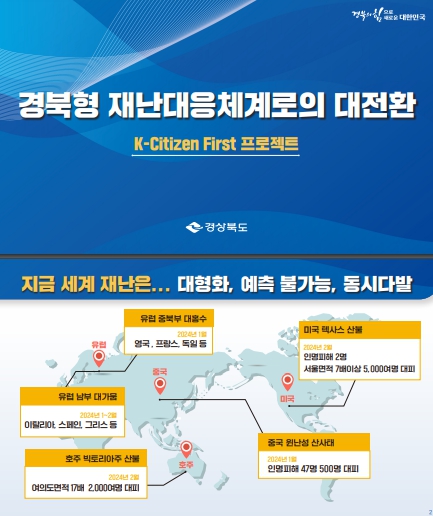 [뉴스서울] 경북도는 재난의 일상화, 극한(대형)화에 따라 기존 관 주도 사후 대응에서 민 ・ 관 협력 사전 예방 체계 구축을 위해 도민 안전을 최우선 원칙으로 하는 ‘K-CITIZEN FIRST 프로젝트’를 본격 추진한다.