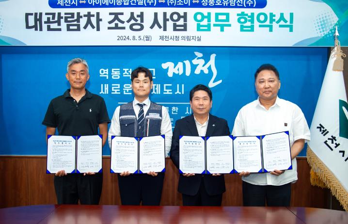지난 5일 제천시청 의림지실에서 김창규 제천시장, 박영기 제천시의회 의장과 투자자인 아이에이종합건설(주), (주)조이, 청풍호유람선(주) 대표이사들 등 관계자들이 참석한 가운데 만남의 광장 관광지 대관람차 조성사업의 성공적인 추진을 위한 업무 협약을 체결했다.
