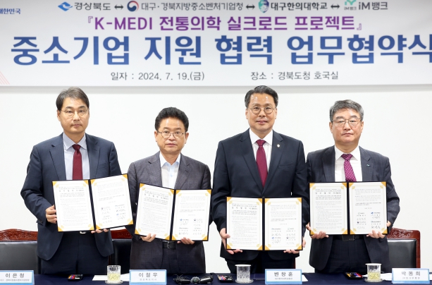 [뉴스서울] 경상북도는 19일 경북도청 호국실에서 ‘경상북도 ↔ 대구·경북지방중소벤처기업청 ↔ 대구한의대학교 ↔ iM뱅크’ 4자간 ‘K-MEDI 전통의학 실크로드 프로젝트 중소기업 지원 협력’ 업무협약을 체결했다.