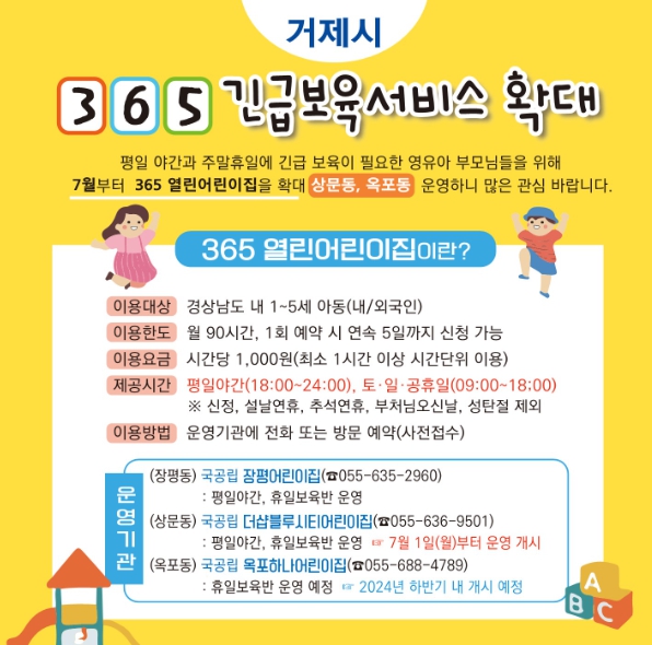 [뉴스서울] 거제시는 긴급한 상황으로 아이돌봄이 필요한 양육자들을 위해 7월부터 ‘365 열린어린이집’을 상문동 소재 더샵블루시티어린이집과 옥포동 소재 국공립 옥포하나어린이집을 추가하여 확대 운영한다.