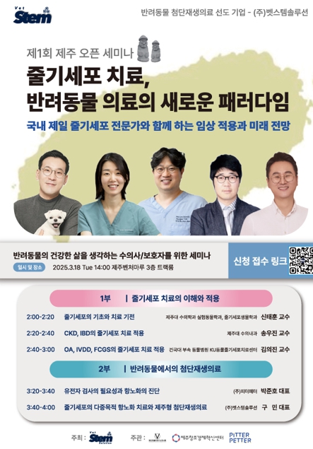 (주)벳스템솔루션이 주최하는 '제1회 제주 오픈 세미나: 줄기세포 치료, 반려동물 의료의 새로운 패러다임'이 오는 3월 18일 오후 2시, 제주벤처마루 3층 트랙룸에서 개최된다.