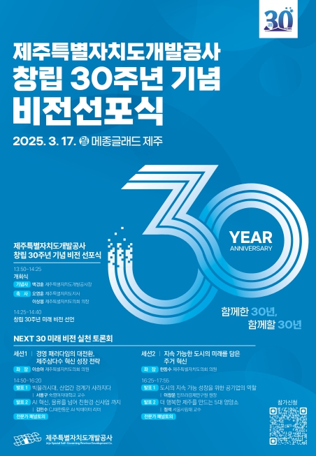 이번 행사는 제주개발공사가 걸어온 30년의 여정을 돌아보고, 앞으로 나아갈 방향을 제시하는 자리로써 오영훈 제주특별자치도지사, 이상봉 제주도의회 의장을 비롯한 협력업체, 공사 임직원, 도민 등 500여 명이 참석할 예정이다.