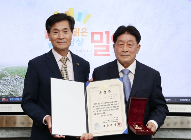 [뉴스서울] 밀양시는 13일 시장실에서 6·25전쟁 당시 강원 평창지구 전투에 참전해 공을 세운 고(故) 민오식 하사의 장남 민병언 씨에게 화랑무공훈장을 전수했다.