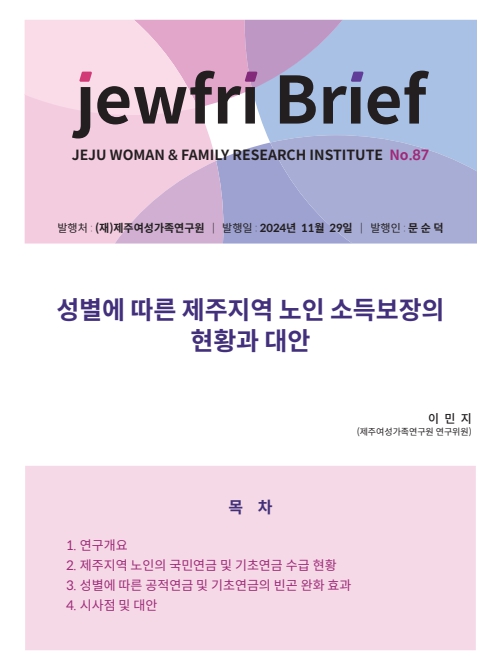 [뉴스서울] 제주여성가족연구원은 제주지역 노인들의 국민연금 및 기초연금과 같은 소득보장 현황을 살펴보고, 개선 방향을 마련하고자'성별에 따른 제주지역 노인 소득보장의 현황과 대안'jewfri Brief(연구책임자, 이민지 연구위원)를 발간했다.