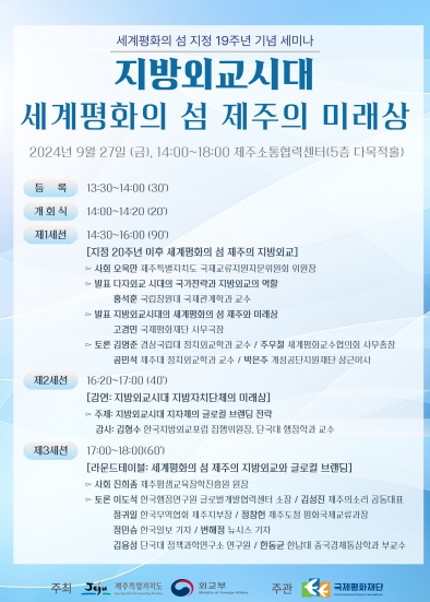 이번 세미나는 세계평화의 섬 지정 19주년 기념 '글로벌 평화도시 제주의 미래와 평화바람 어울림 한마당'의 두 번째 지방보조금 사업으로 제주특별자치도와 외교부가 주최하고, 국제평화재단이 주관하여 공개 세미나로 진행된다.