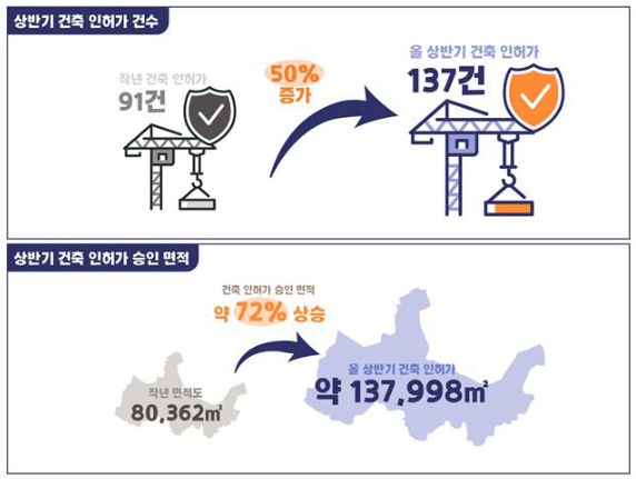 또한, 건축 인허가 승인 면적도 전년 80,362㎡ 대비 약72%가 상승한 약 137,998㎡에 이르렀다.