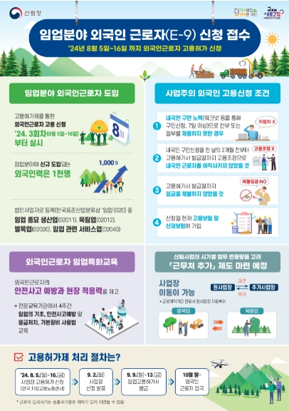 [뉴스서울] 산림청은 임업분야 인력난 해소와 고용안정을 위해 다음달인 8월 5일부터 16일까지 임업분야 외국인근로자 고용허가(E-9) 신청이 가능하다고 밝혔다.