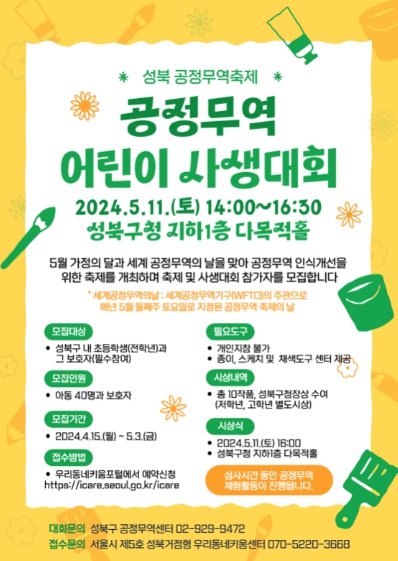 참여 신청은 우리동네키움포털 누리집에서 예약신청 가능하며, 접수기간은 4월 15일부터 5월 3일까지이다. 사생대회는 5월 11일 2시부터 성북구청 지하1층 다목적홀에서 열린다. 참가자 중 심사를 통해 총 10명에게 성북구청장 상을 수여하며 이 외에도 다양한 공정무역 체험 프로그램이 준비되어 있다.