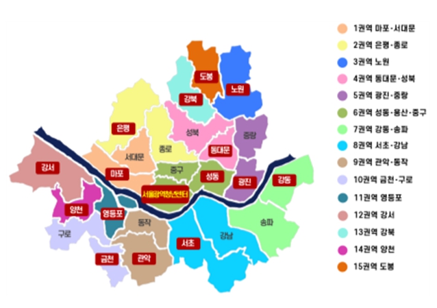 ▲ 2024년 서울청년센터 사업권역 (15권역) |