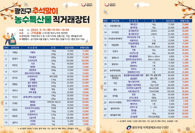 [뉴스서울] 광진구가 오는 10일 구의공원에서 ‘추석맞이 농수특산물 직거래장터’를 개최한다.