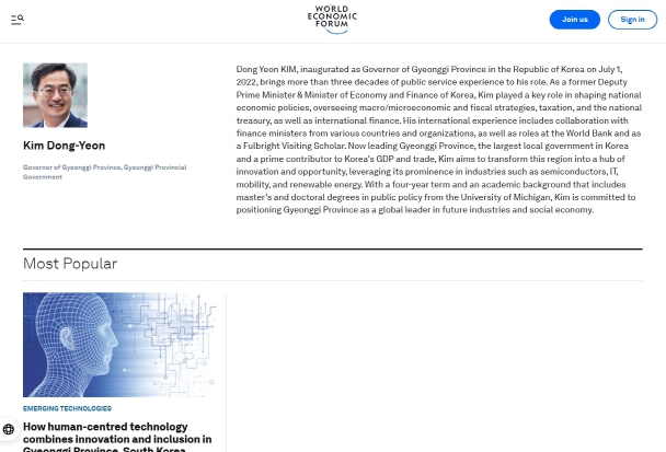 한편, 다보스포럼은 특별세션을 통해 김 지사에 대한 소개 페이지를 만들어 제공하고 있다. 다보스포럼은 “김동연 지사는 30년 이상의 공직 경험을 바탕으로 경기도를 이끌고 있다. 대한민국 경제부총리 겸 기획재정부 장관을 역임했으며 국가 경제 정책 수립에 핵심적인 역할을 수행했고, 거시·미시경제, 재정 전략, 조세, 국가 재정 및 국제 금융 등을 총괄했다. 대한민국 GDP와 무역에서 중요한 역할을 하는 최대 지방정부인 경기도를 이끌며, 반도체, IT, 모빌리티, 재생에너지와 같은 첨단산업에서의 경기도의 입지를 활용해 이 지역을 혁신과 기회의 중심지로 탈바꿈시키고자 한다”고 소개했다.