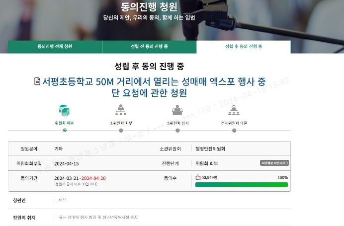 한편 지난 3월 21일 시작된 성인페스티벌 반대 ‘국회 국민동의청원’ 게시 청원은 4월 15일 기준 5만 명을 돌파해 국회 행정안전위원회에 회부됐다. 위원회 심사를 거쳐 채택되면 본회의에 상정해 심의하고, 정부에 이송한다. 국회 국민동의청원은 30일 이내 5만 명의 동의가 이뤄져야 진행된다.
