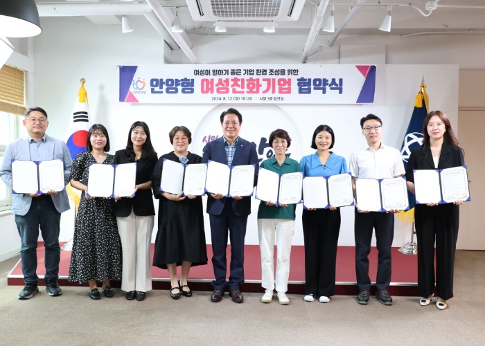 [뉴스서울] 안양시는 12일 오전 10시 30분 시청 접견실에서 근로자의 일·생활 양립과 성평등한 근무환경 조성에 노력하는 관내 기업 8곳과 ‘안양형 여성친화기업’ 협약을 체결했다.