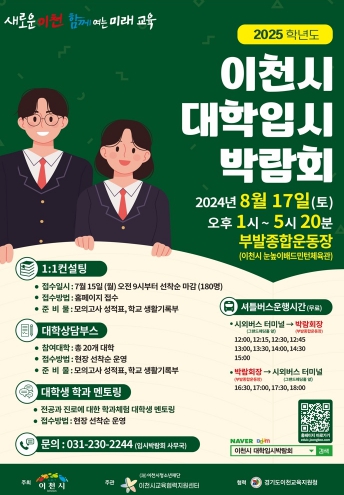 [뉴스서울] 이천시에서는 관내 학생과 학부모에게 최신 대학 진학 정보를 제공하기 위해 다음달 17일 이천시종합운동장내 이천시눈높이배드민터체육관에서 '2025학년도 이천시 대학입시 박람회'를 개최한다고 밝혔다.