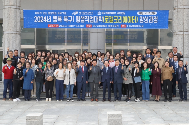 지역의 새로운 가치를 창출하여 지역사회개발 및 전구민이 행복한 북구 만들기를 위한 전문가로서의 리더십 함양 및 역량 강화의 기회를 제공하기 위한 평생학습프로그램인 ‘로컬 크리에이터 양성과정’의 개강식을 배광식 북구청장과 김범국 대구과학대학교 부총장 및 수강생 60여명이 참석한 가운데 개최했다.