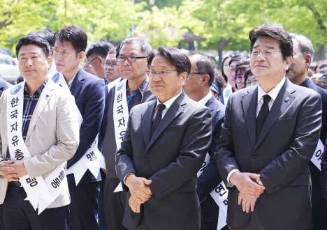 ▲ 강기정 광주광역시장이 26일 오전 북구 국립5·18민주묘지에서열린 한국자유총연맹 국립 5·18 묘역 참배 및 정화활동에 참석해 강석호 총재 등과 행사를 진행하고 있다 |