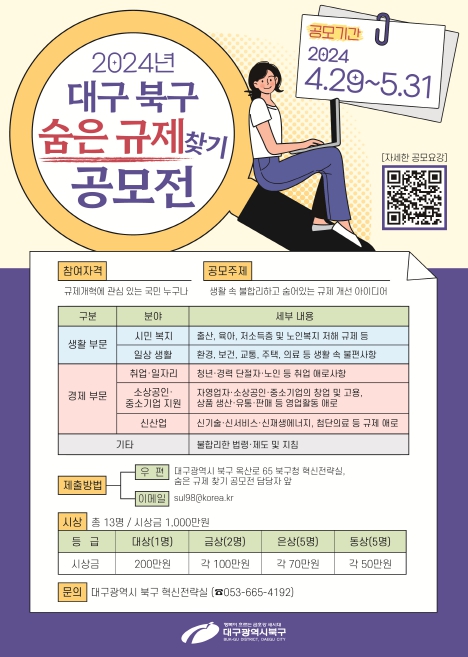 [뉴스서울] 대구 북구청은 일상생활에 불편을 주고, 기업 및 소상공인의 경제활동을 저해하는 불합리한 규제를 개선하기 위해 전국민을 대상으로‘2024년 대구 북구 숨은 규제 찾기 공모전’을 개최한다.