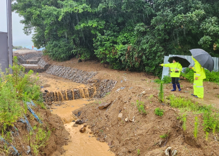 이날 임 부시장은 우기철 현장 주변 토사 유출을 막기 위해 일부 절개지 사면에 방수포 보강, 가배수 정비, 현장관리인 상시 대기, 주기적 예찰 활동 등을 지시했다.