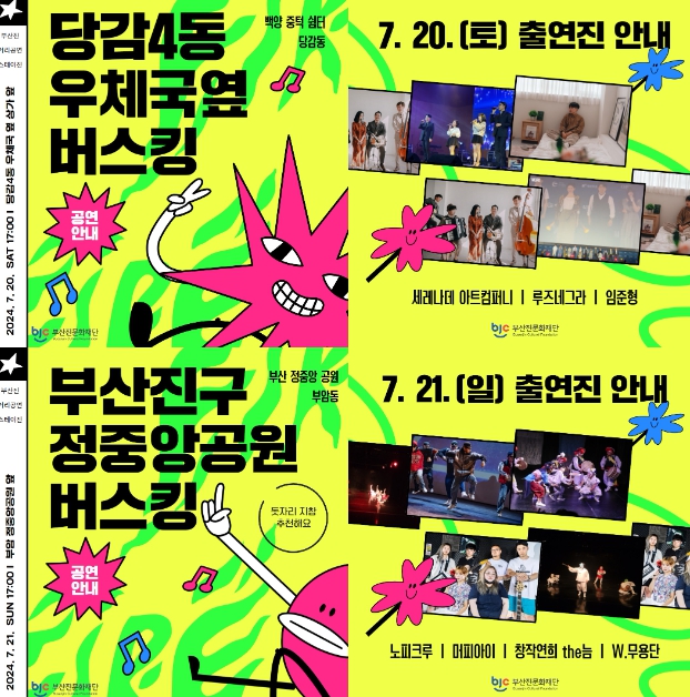뒤이어 21일 17시에는 부산 정중앙공원에서 ‘노피크루’, ‘머피아이’, ‘W무용단’의 흥겨운 스트릿댄스와 현대무용, 한국무용에 이어 ‘창작연희 the늠’의 신나는 연희마당이 펼쳐진다.