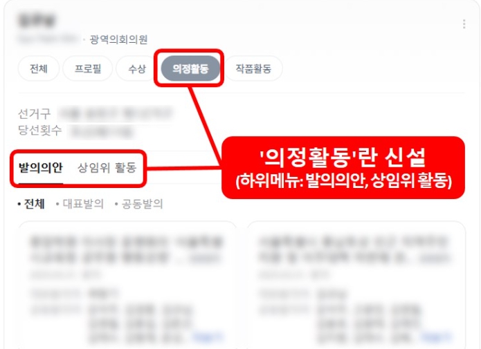 ▲ 네이버 인물정보 서비스 ‘의정활동’ 영역 신설 예시 |