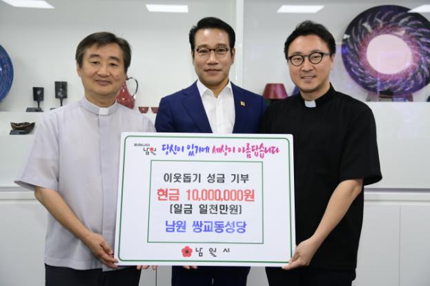 [뉴스서울] 천주교 전주교구 남원 쌍교동 성당에서는 제94회 춘향제 행사 기간 음식 나눔 바자회를 열어 얻은 수익금 1,000만원을 27일 남원시노인복지관에 기부하여 훈훈하고 따뜻한 정을 나누었다.