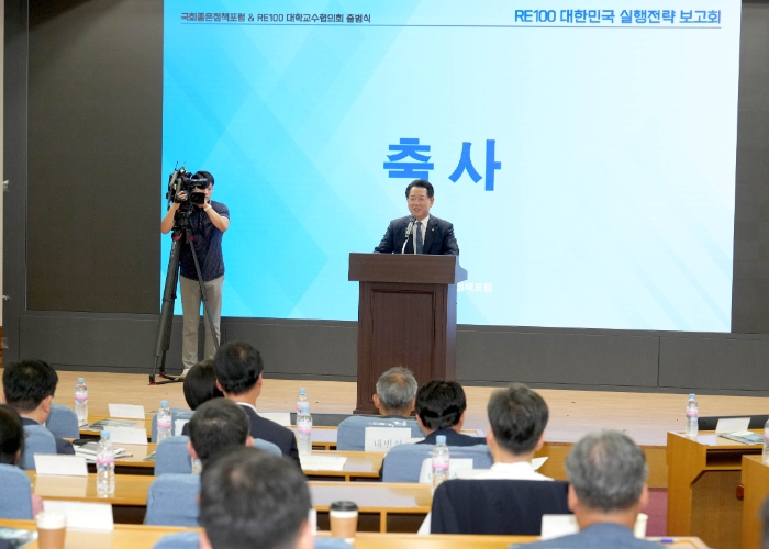 ▲ 김영록 전라남도지사가 8일 국회의원회관에서 열린 ‘국회 좋은정책포럼·RE100 대학교수협의회 출범식’에서 인사말을 하고 있다. |