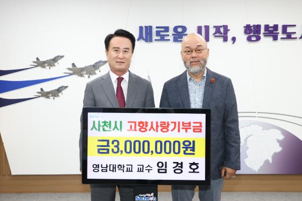 영남대학교 시각디자인학과 임경호 교수가 19일 사천시청을 방문해 지역사회발전을 위해 써 달라며 고향사랑기부금 300만 원을 기탁했다.