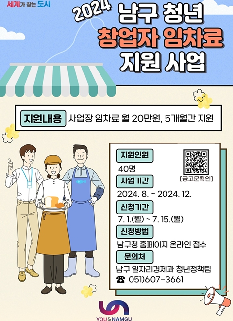 대상은 남구에 거주하고 남구 내 사업장을 두고 있는 5년 이내 창업한 청년(18 부터 39세) 사업자로 연 매출액 1억원 이하, 월 임차료가 30만원 이상인 청년사업자가 신청가능하다.